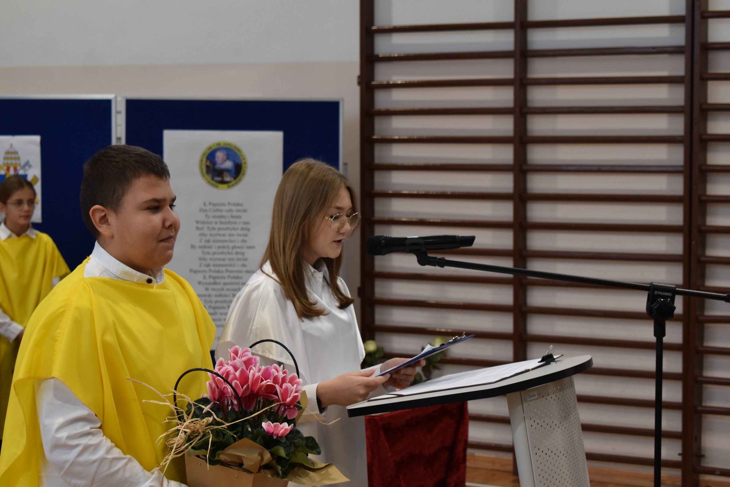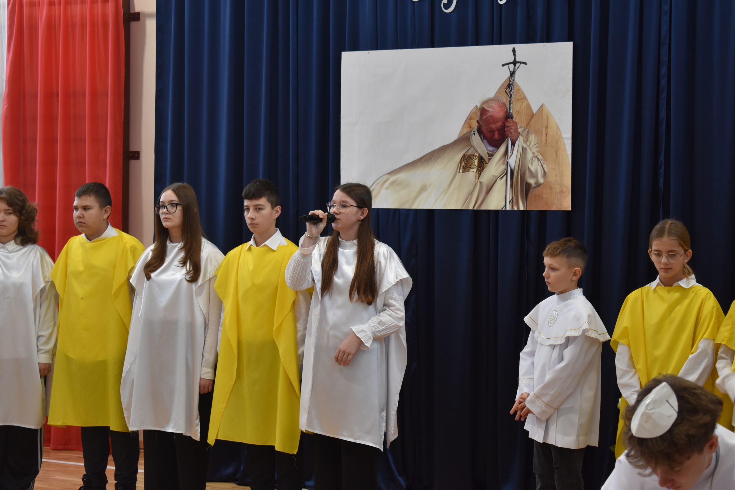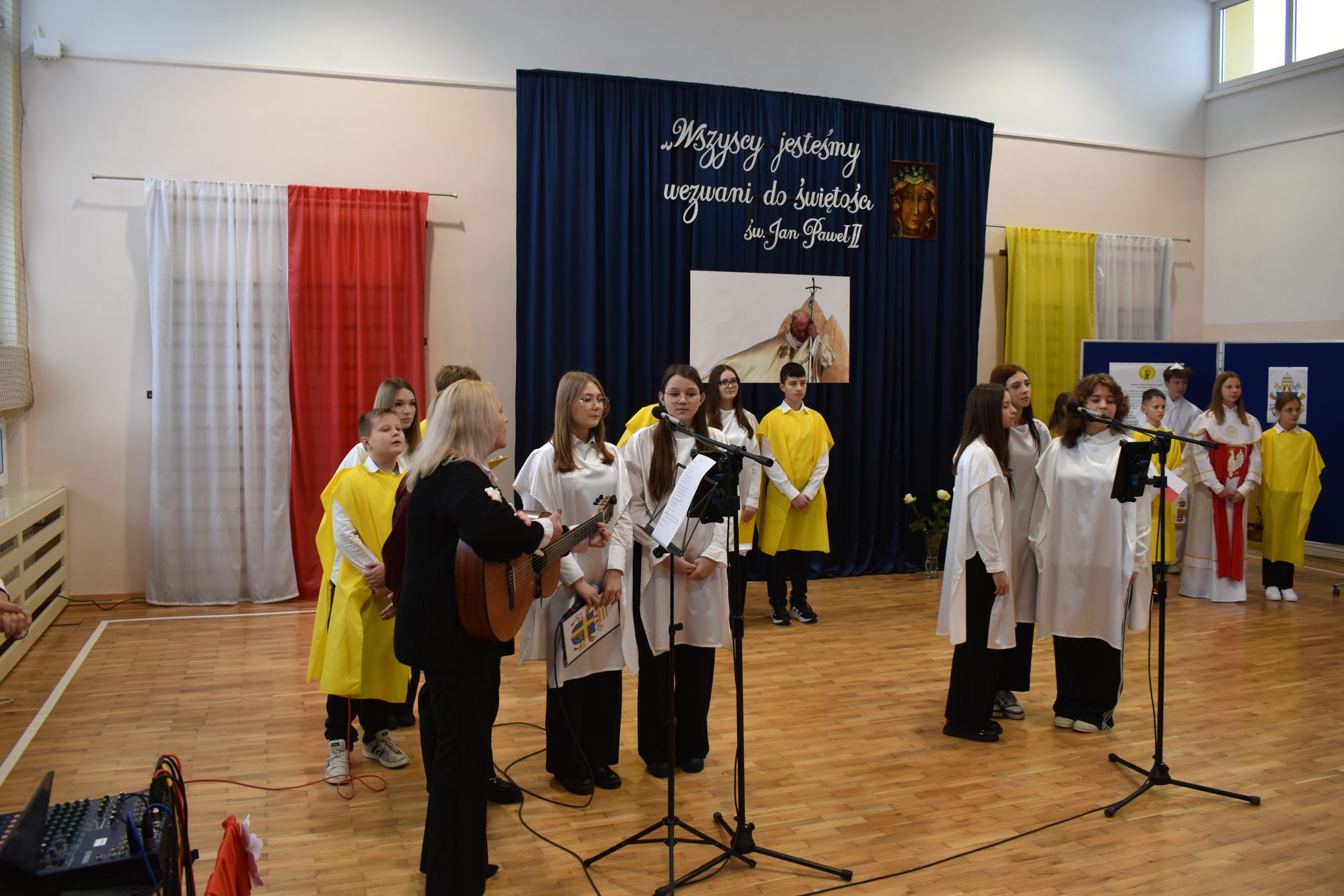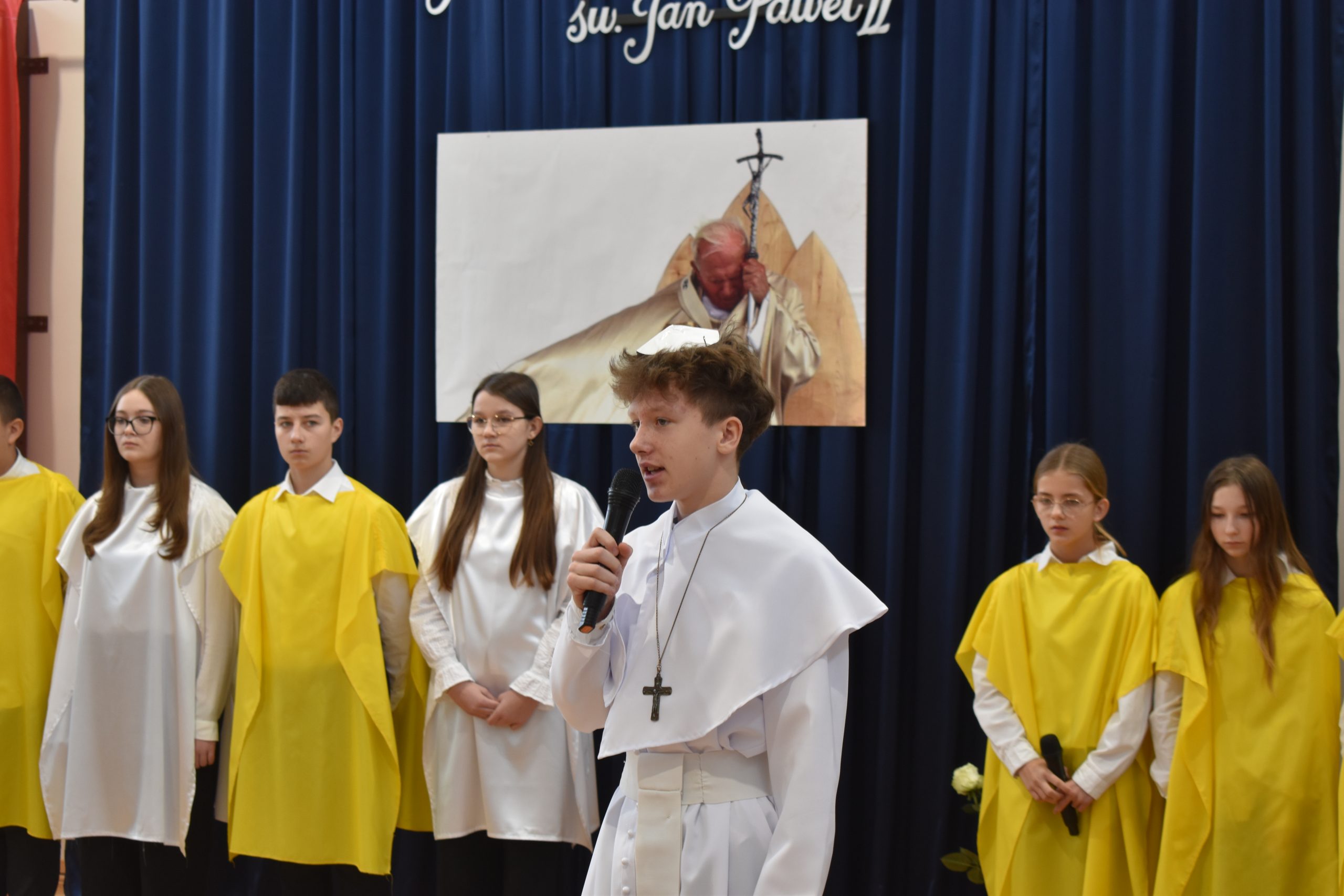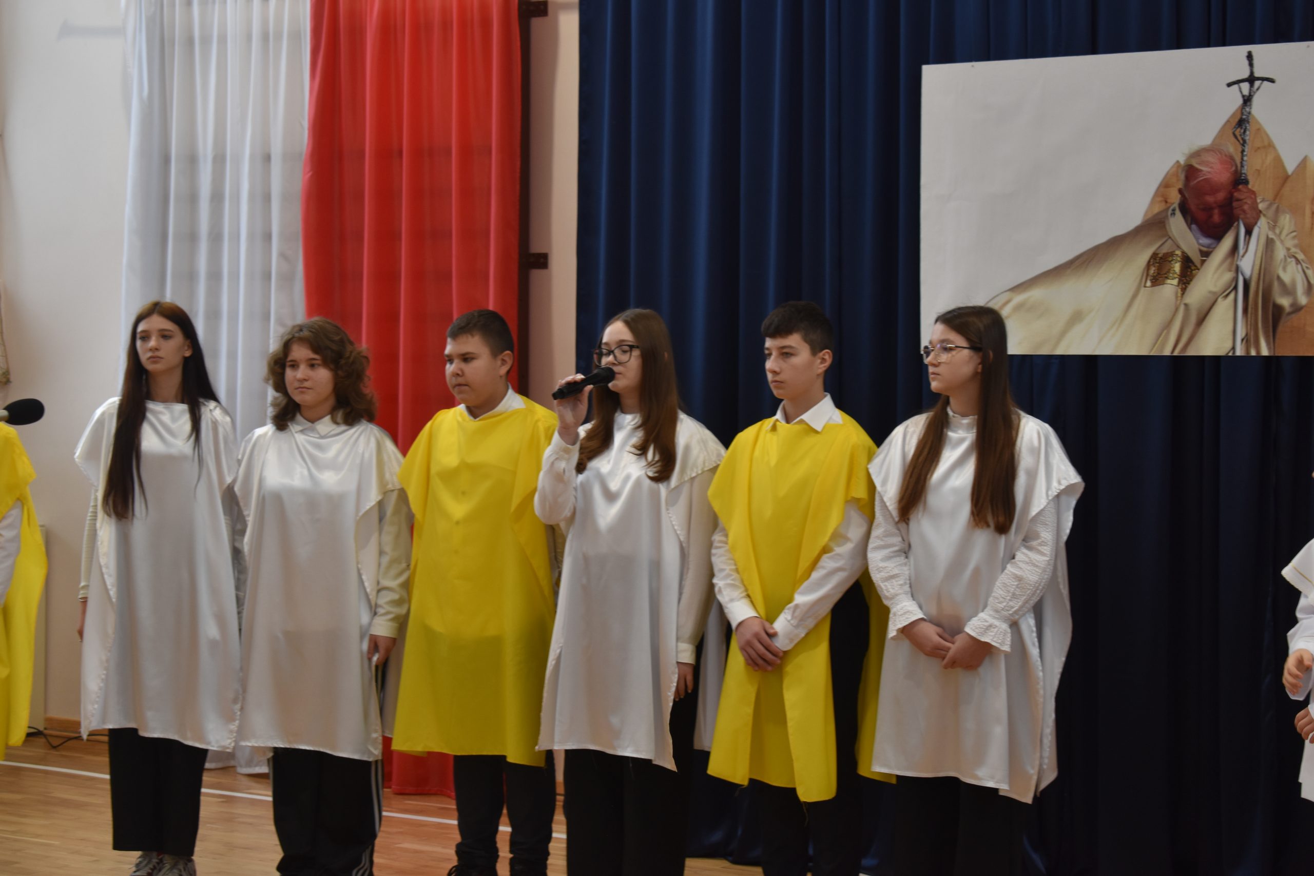 Uroczystość rozpoczęła się powitaniem delegacji szkół, po którym zaprezentowano część artystyczną przygotowaną przez uczniów gospodarzy. Program nawiązywał do życia i przesłania Jana Pawła II, podkreślając jego rolę jako autorytetu moralnego, orędownika pokoju i dialogu oraz przewodnika młodzieży. Młodzi artyści, poprzez recytacje, śpiew i krótkie sceniczne formy, przypomnieli najważniejsze momenty pontyfikatu Papieża Polaka.