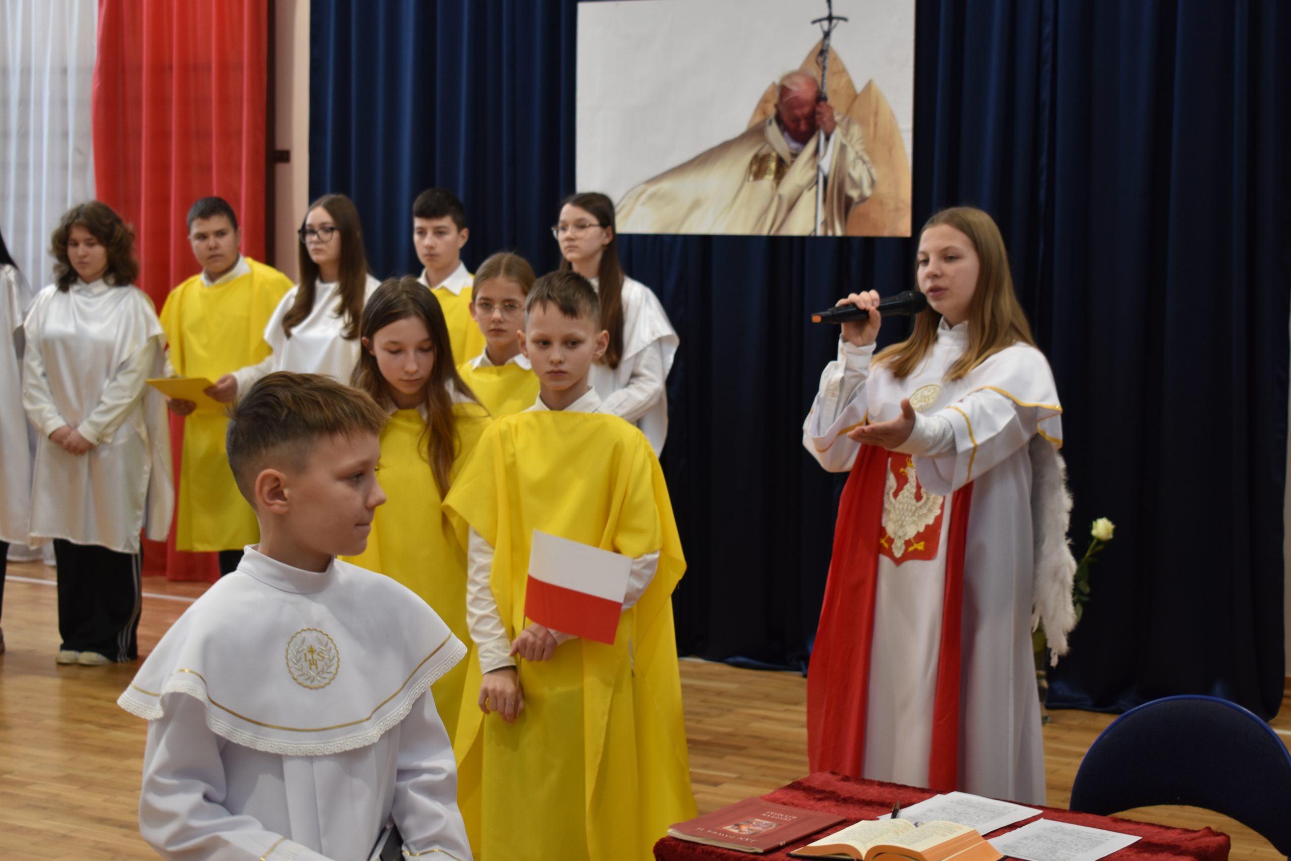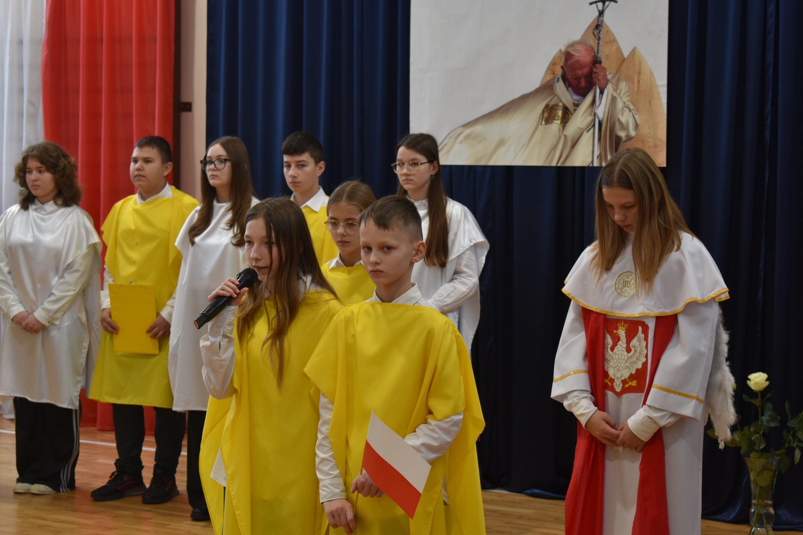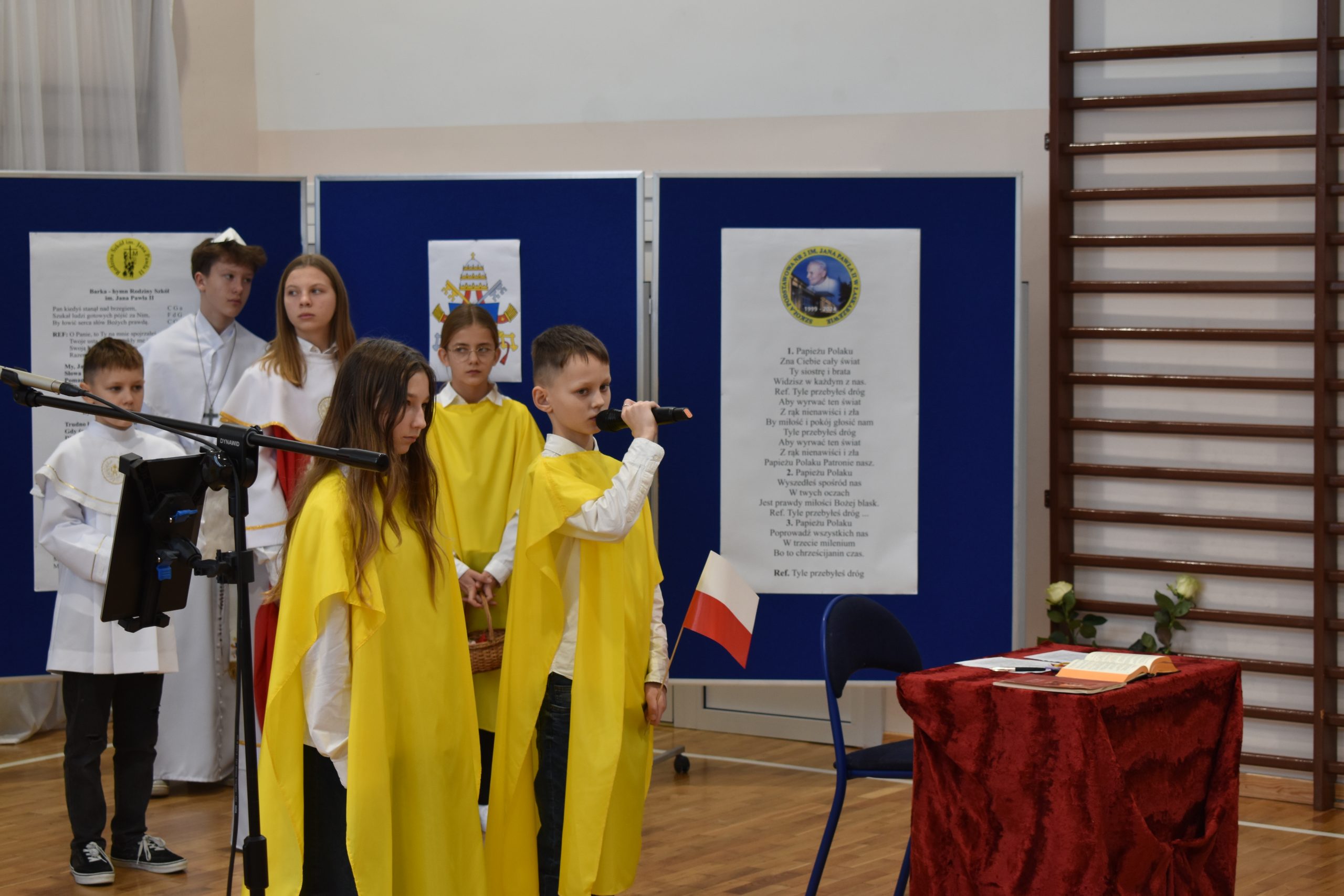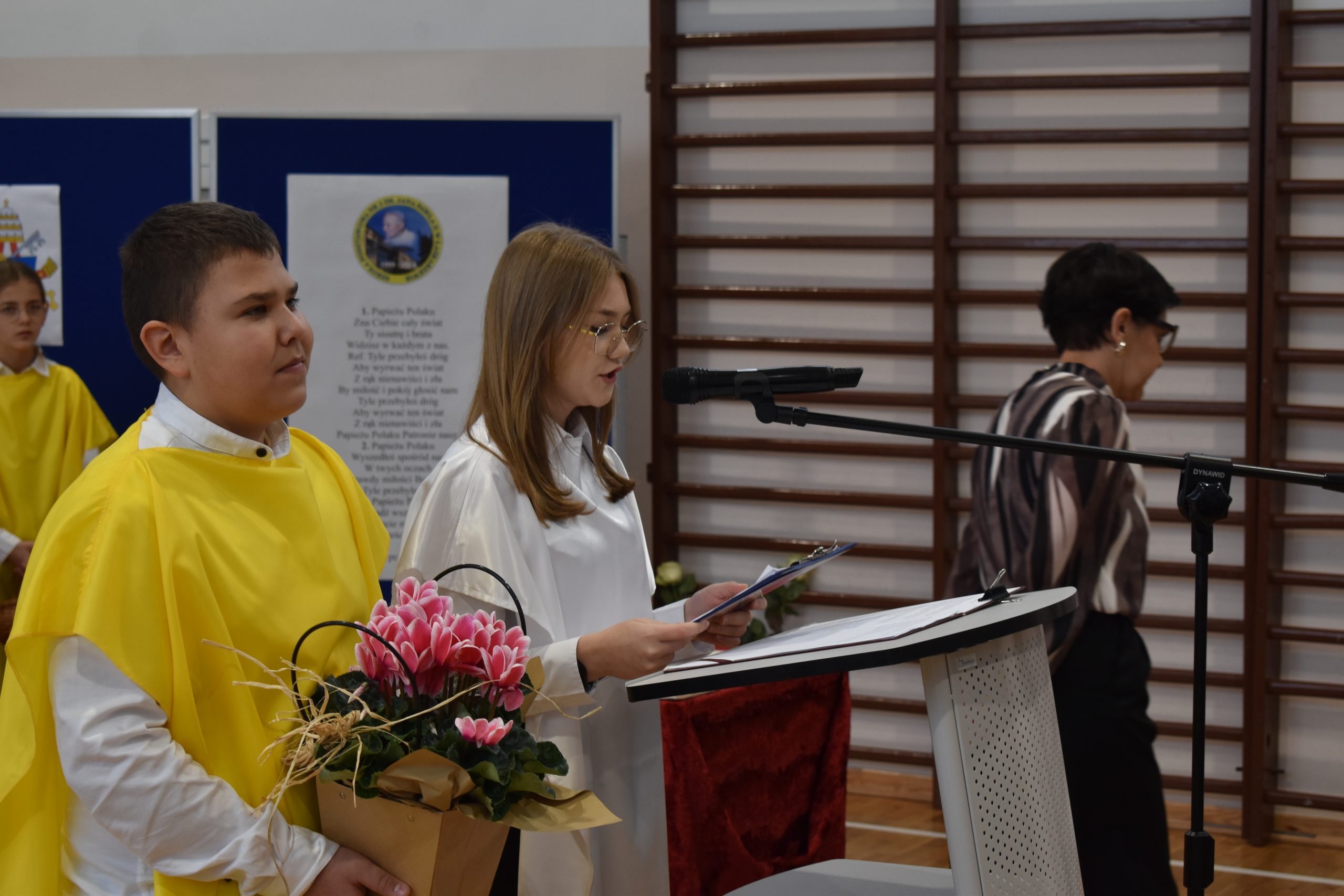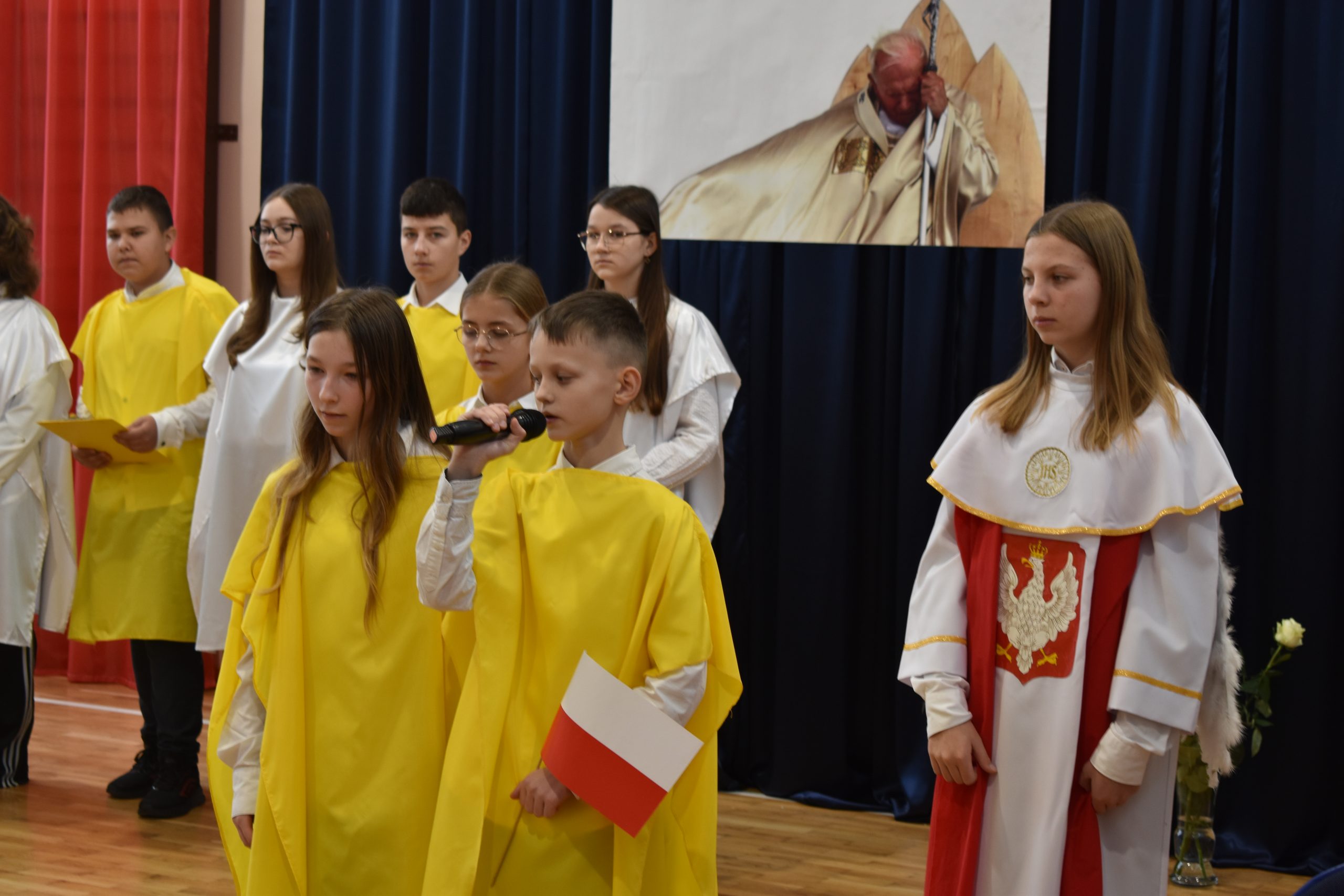 Uroczystość rozpoczęła się powitaniem delegacji szkół, po którym zaprezentowano część artystyczną przygotowaną przez uczniów gospodarzy. Program nawiązywał do życia i przesłania Jana Pawła II, podkreślając jego rolę jako autorytetu moralnego, orędownika pokoju i dialogu oraz przewodnika młodzieży. Młodzi artyści, poprzez recytacje, śpiew i krótkie sceniczne formy, przypomnieli najważniejsze momenty pontyfikatu Papieża Polaka.