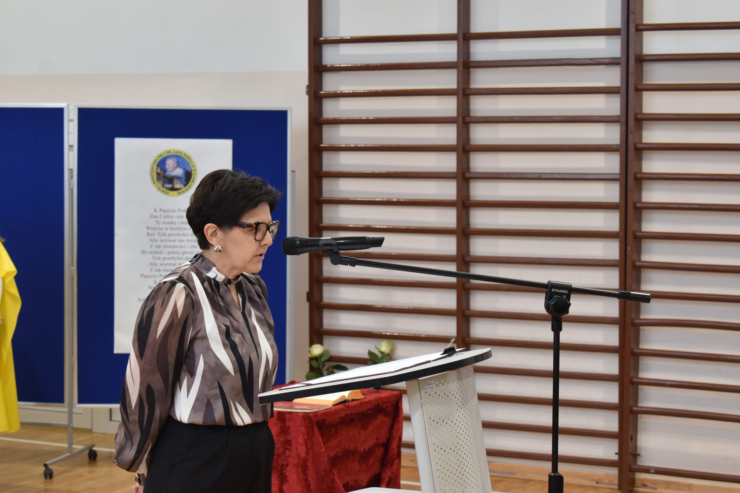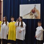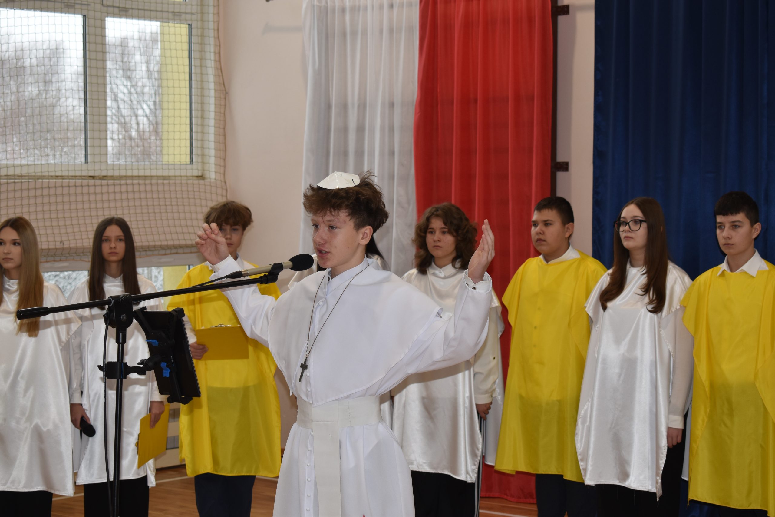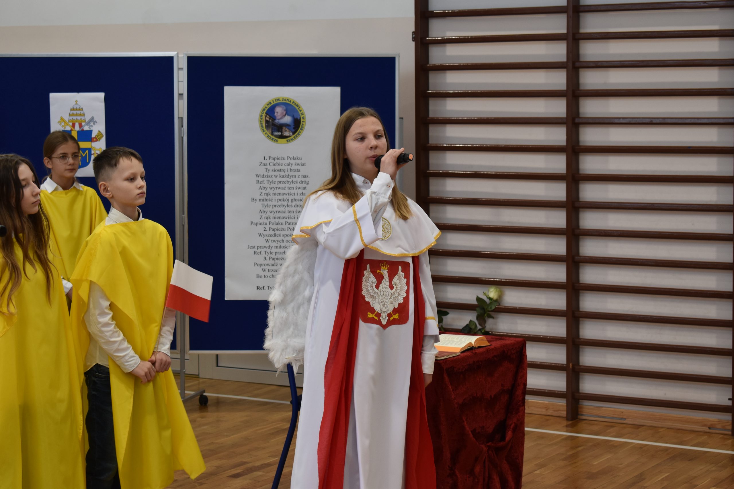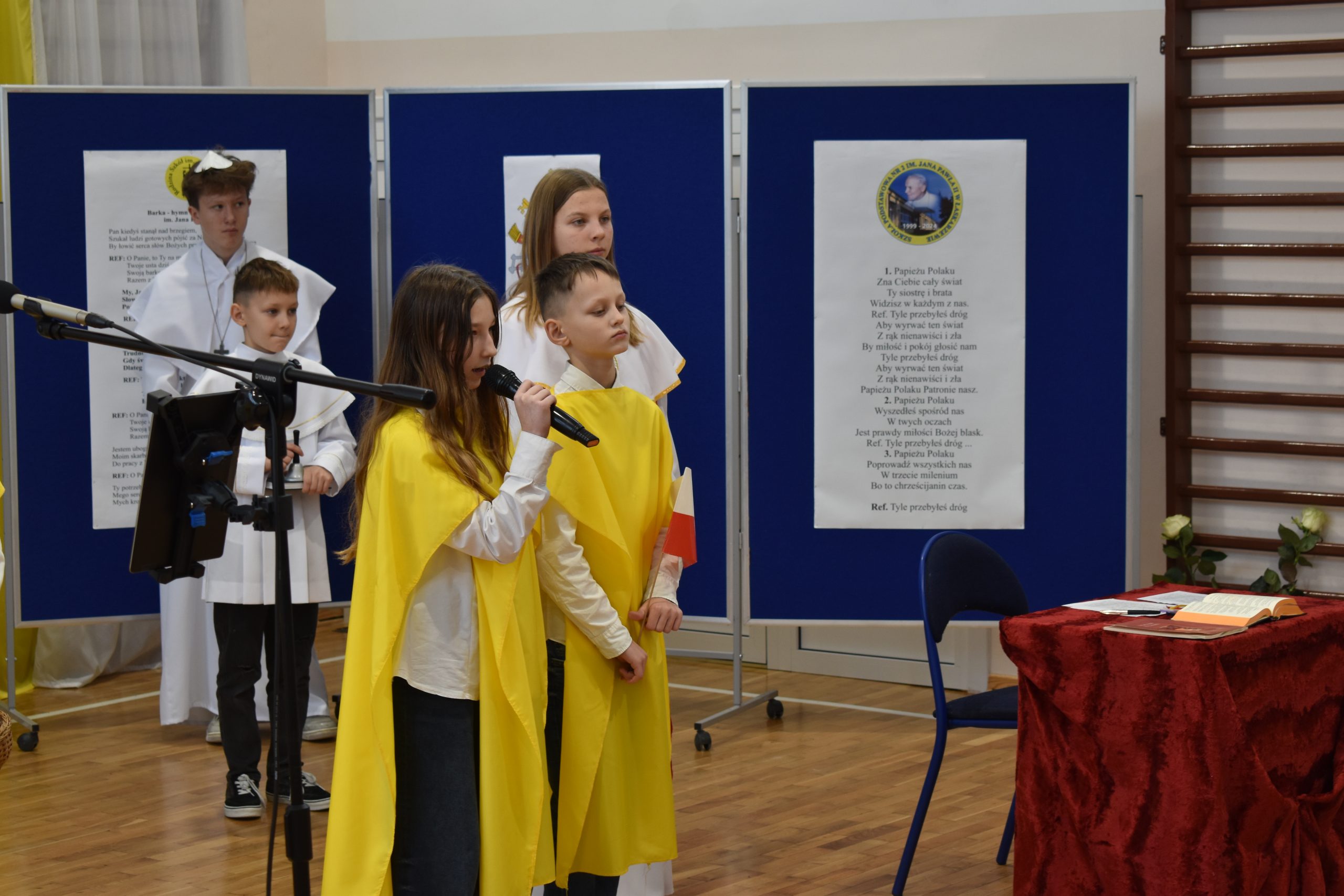 Uroczystość rozpoczęła się powitaniem delegacji szkół, po którym zaprezentowano część artystyczną przygotowaną przez uczniów gospodarzy. Program nawiązywał do życia i przesłania Jana Pawła II, podkreślając jego rolę jako autorytetu moralnego, orędownika pokoju i dialogu oraz przewodnika młodzieży. Młodzi artyści, poprzez recytacje, śpiew i krótkie sceniczne formy, przypomnieli najważniejsze momenty pontyfikatu Papieża Polaka.