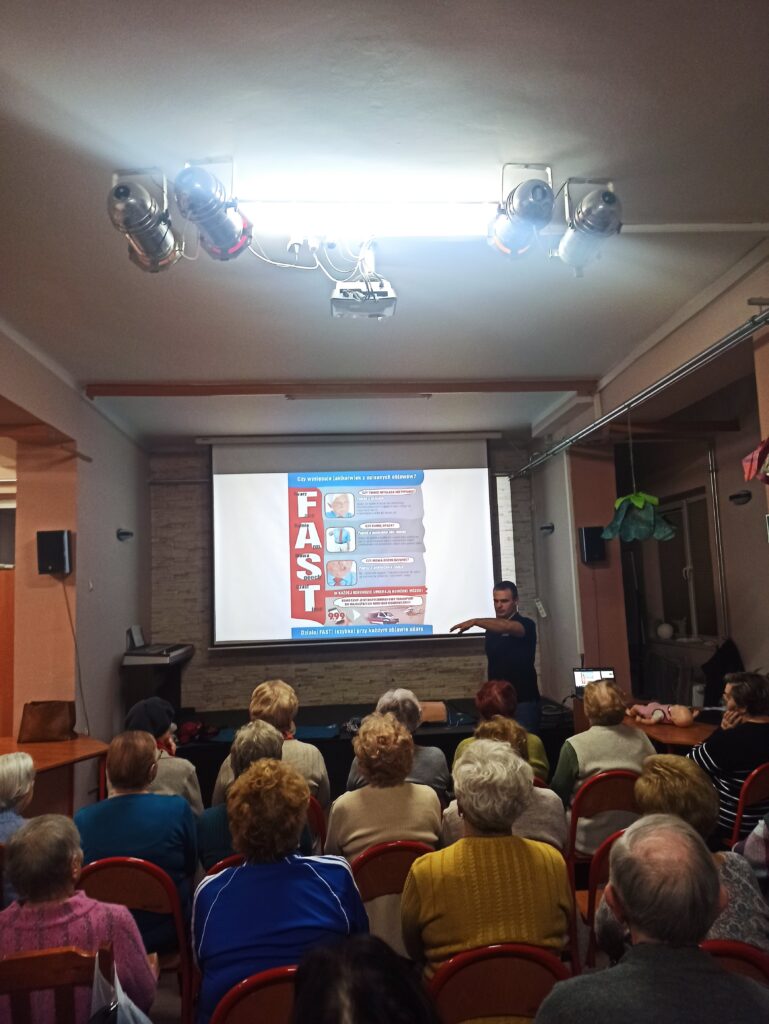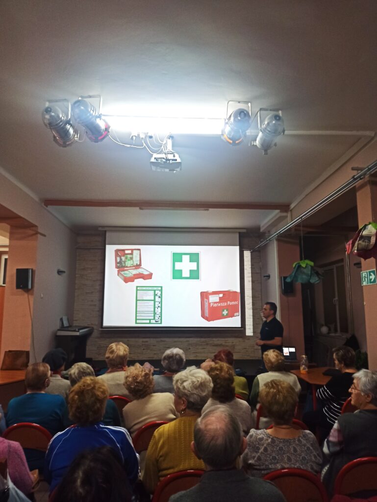 Zajęcia poprowadził pan Jakub Sadkowski – ratownik medyczny, który w przystępny i bardzo praktyczny sposób omówił najważniejsze zagadnienia związane z bezpieczeństwem zdrowotnym osób starszych .