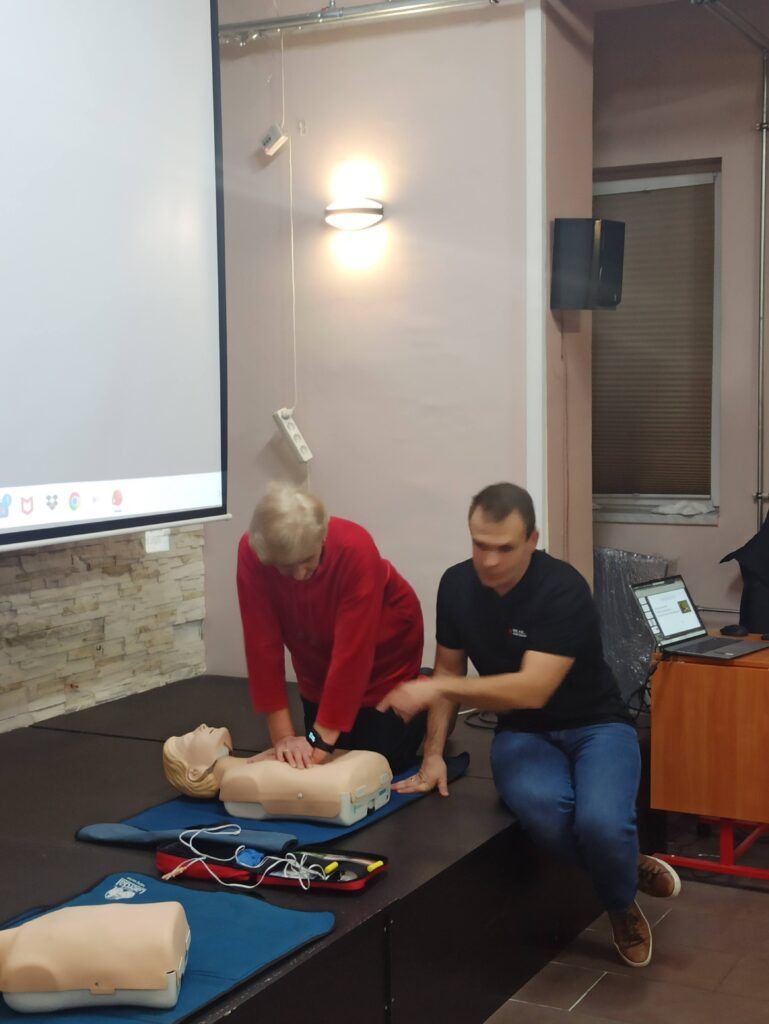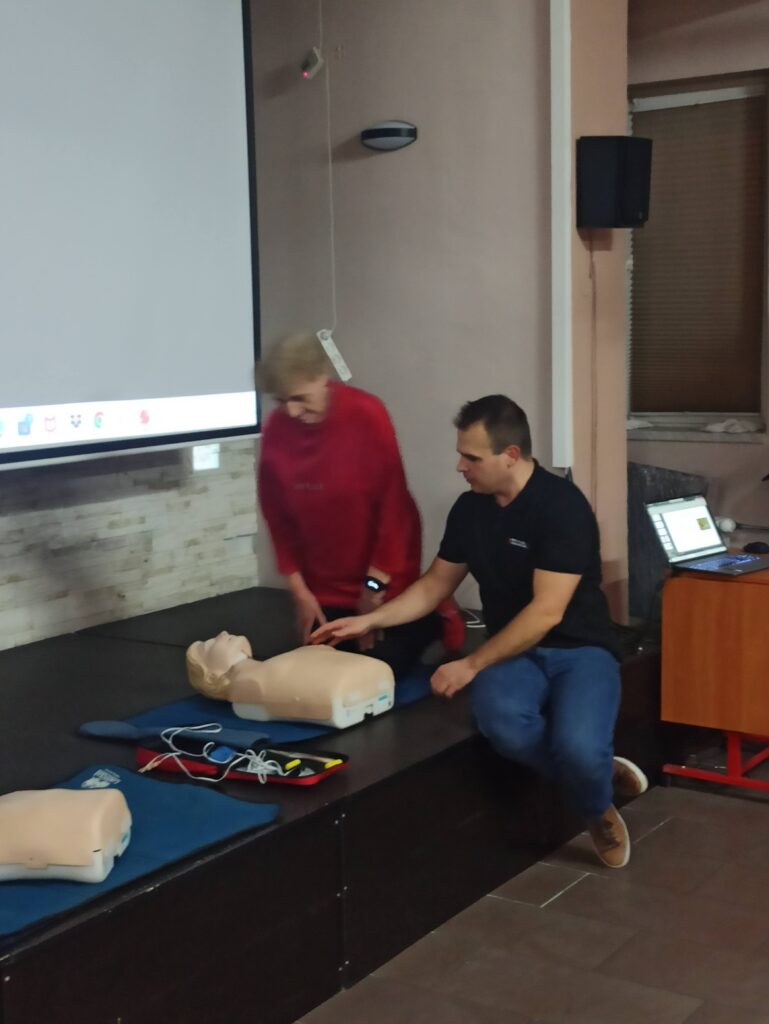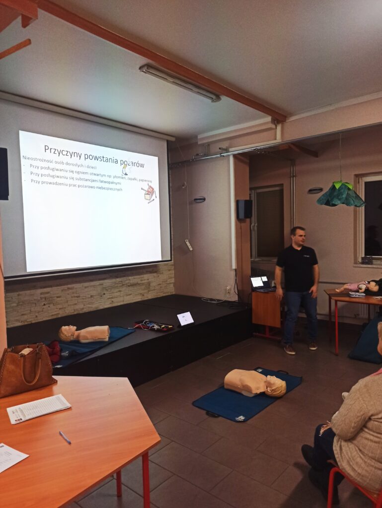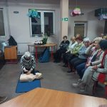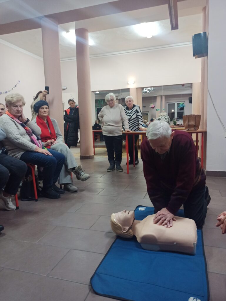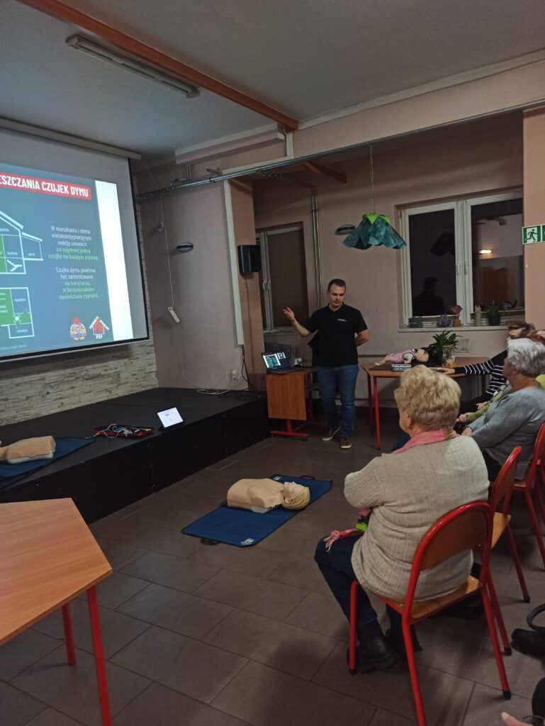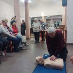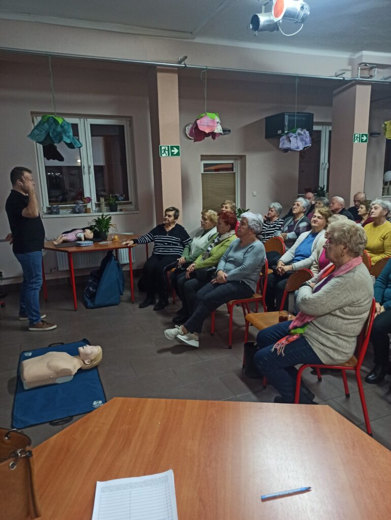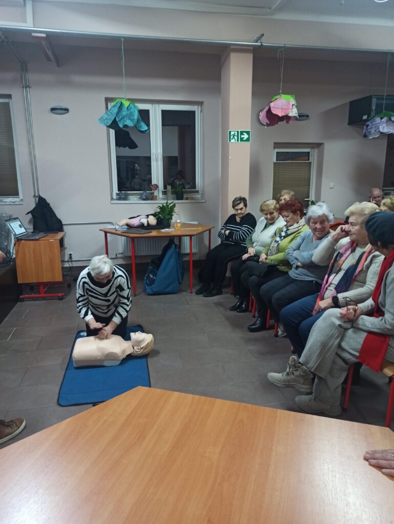 Bardzo ważnym elementem spotkania były praktyczne ćwiczenia – seniorzy mogli sprawdzić w praktyce schematy postępowania, nauczyć się poprawnego układania osoby poszkodowanej oraz przećwiczyć czynności ratownicze pod okiem instruktora.