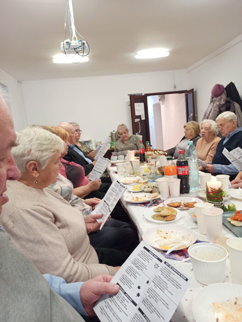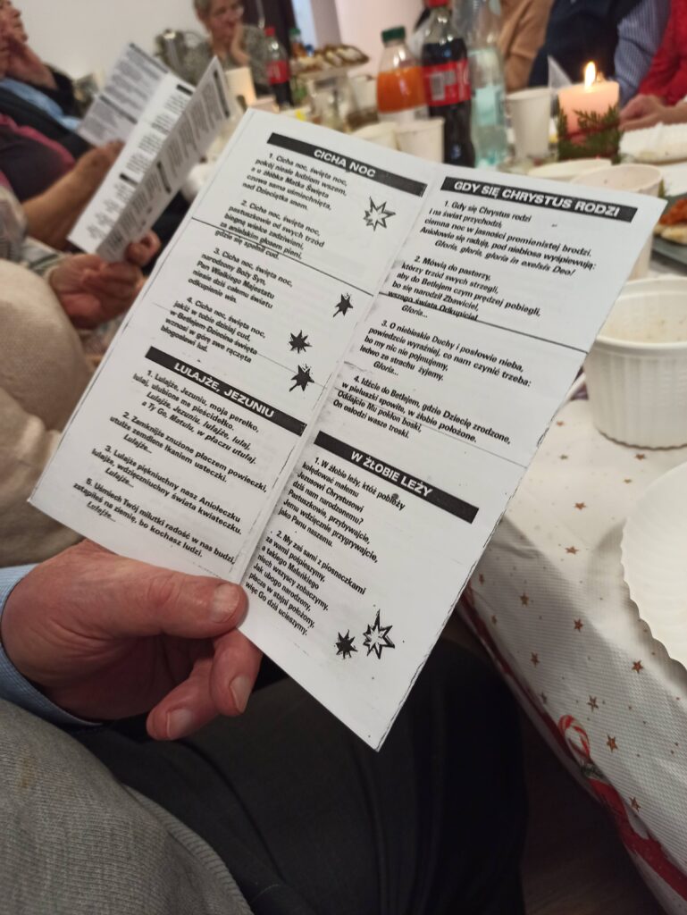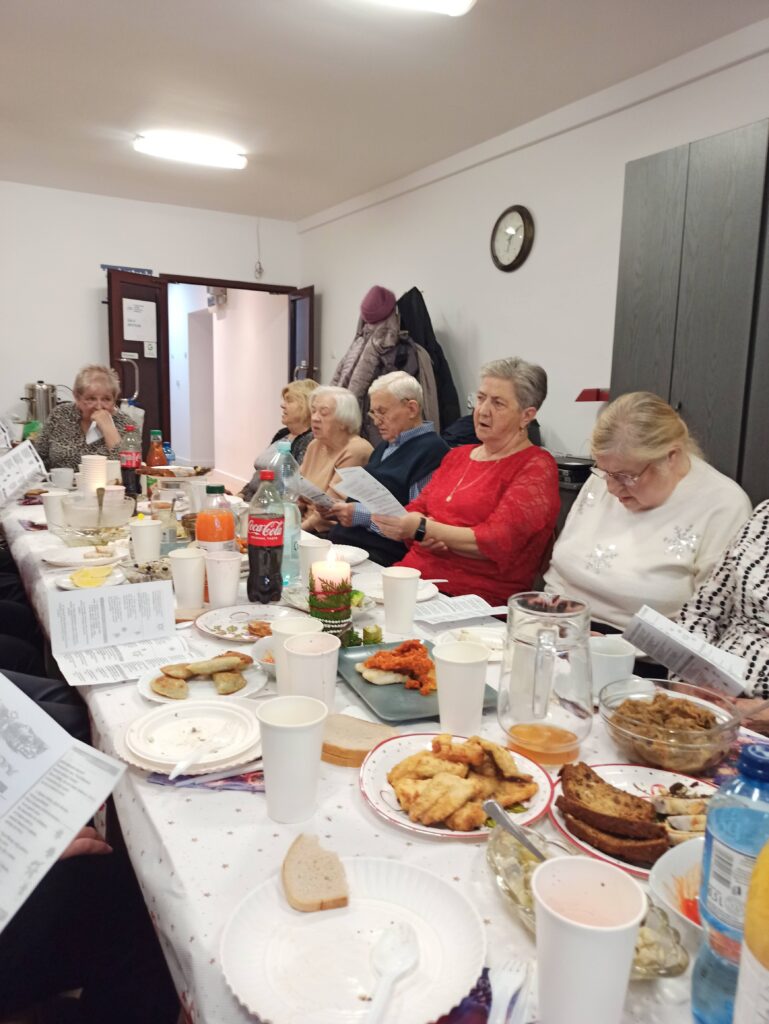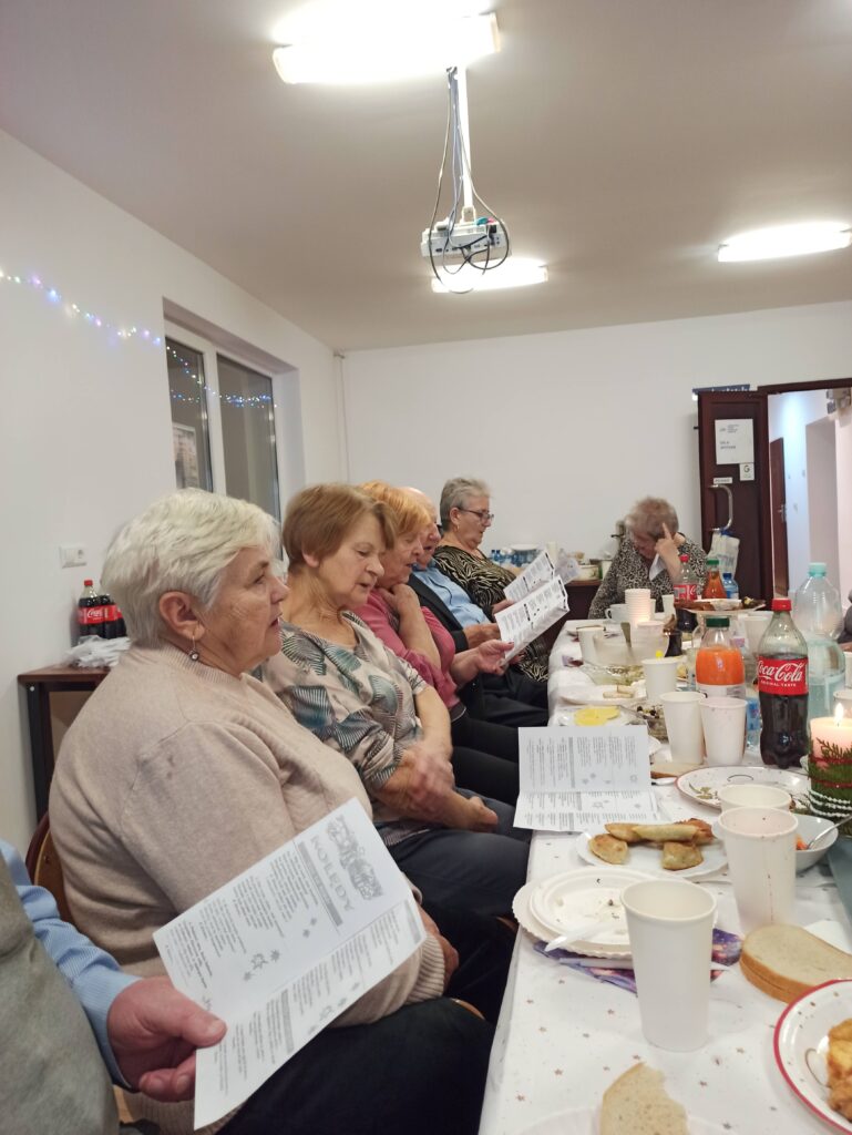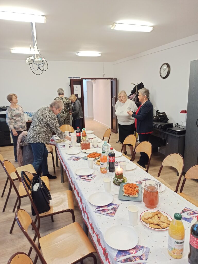 Każdy z uczestników przyniósł przygotowaną przez siebie świąteczną potrawę, dzięki czemu stół szybko zapełnił się tradycyjnymi smakami: pierogami, rybą, barszczem, śledziami oraz domowymi wypiekami. Dzielenie się potrawami stało się okazją do rozmów, wspomnień i budowania poczucia wspólnoty. Seniorzy zadbali również o świąteczny wystrój sali gdzie znalazło się miejsce na rozświetloną choinkę.