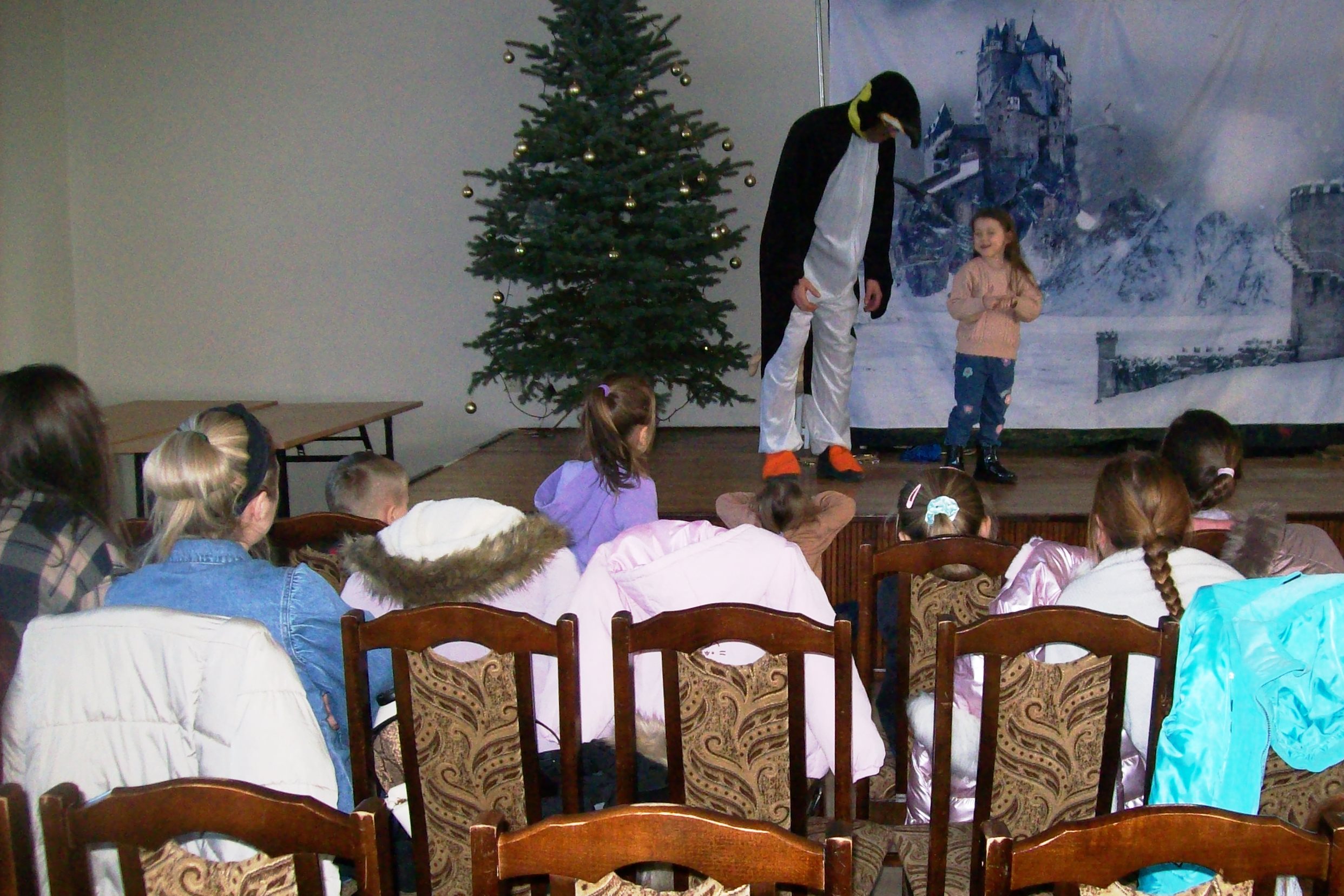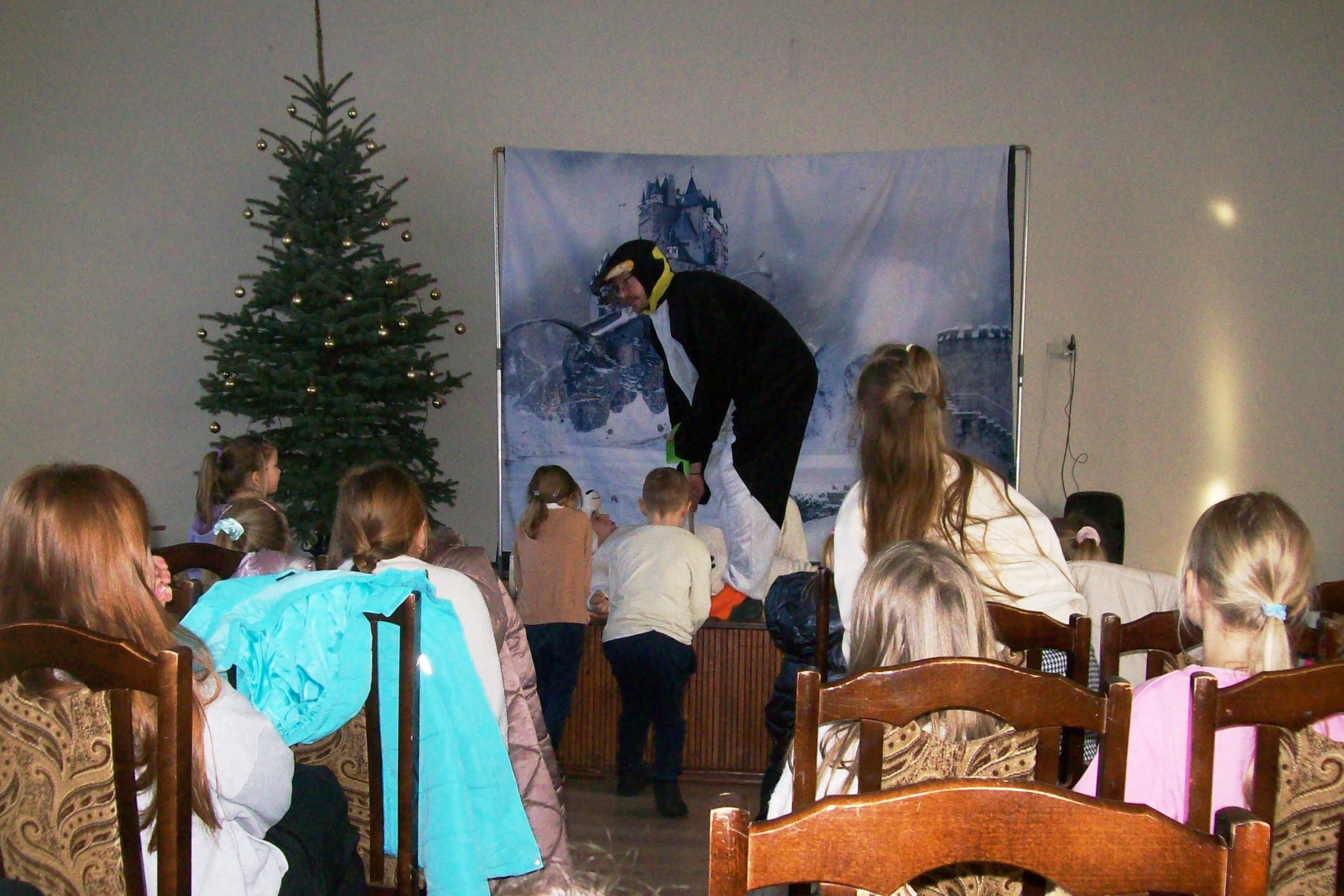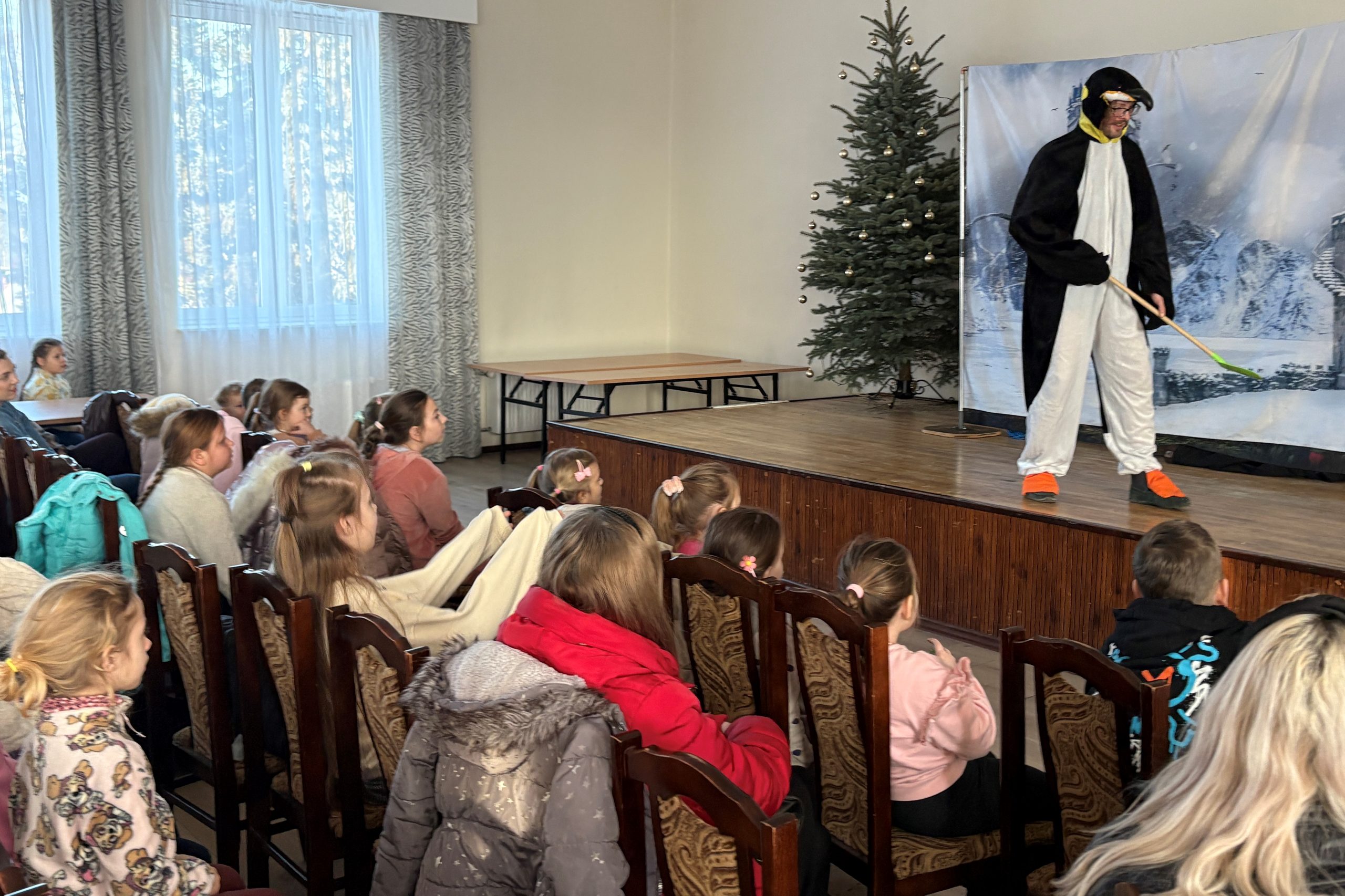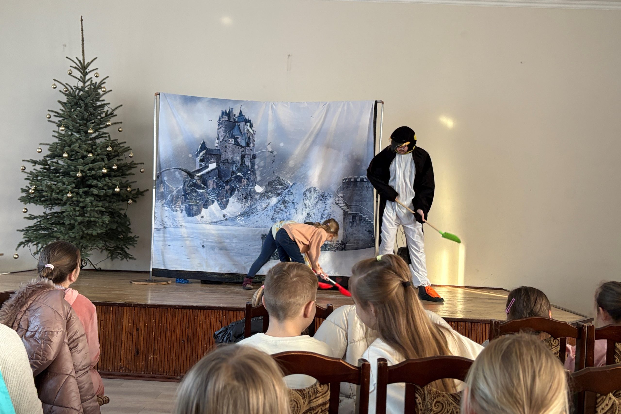 22 stycznia 2026 roku Miejska Biblioteka Publiczna gościła aktorów teatru „Krak-Art” z Krakowa ze spektaklem „Zimowa opowieść”. Ta pełna magii i ciepła historia przeniosła dzieci w zimowy świat wyobraźni, przyjaźni i małych cudów. W odległej Krainie Magii żył sobie elf Chichotek , który uwielbiał robić wszystkim żarty. Mieszkańcy magicznej krainy ciągle na niego narzekali. Często zdarzało się, że jego żarty wcale nie były takie śmieszne. Któregoś razu zabrał różdżkę Wróżce, która zamieniła go za karę w śmiesznego, niezdarnego pingwina i wysłała do Lodowej Krainy. Rządziła tam Śnieżna Królowa, która kazała wszystkim mieszkańcom ciężko pracować. Porządku w krainie pilnował strażnik królowej – leniwy Niedźwiedź Polarny. Zaczarowany elf-pingwin poznał Renifera, który też był tam za karę i bardzo tęsknił za domem. Pingwinek postanowił mu pomóc. Udało im się uciec z niewoli u królowej, ale po powrocie do domu Pingwinek był smutny, bo chciałby znowu być elfem. Jak to w bajkach bywa, wszystko dobrze się skończyło, wróżka przywróciła Chichotkowi dawną postać.