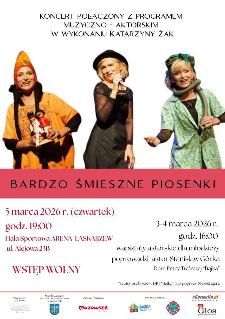 W czwartek, 5 marca 2026 r. o godz. 19:00 w Hali Sportowej ARENA ŁASKARZEW (ul. Alejowa 23B) odbędzie się wyjątkowy koncert połączony z programem muzyczno-aktorskim „Bardzo śmieszne piosenki” w wykonaniu znakomitej Katarzyny Żak.